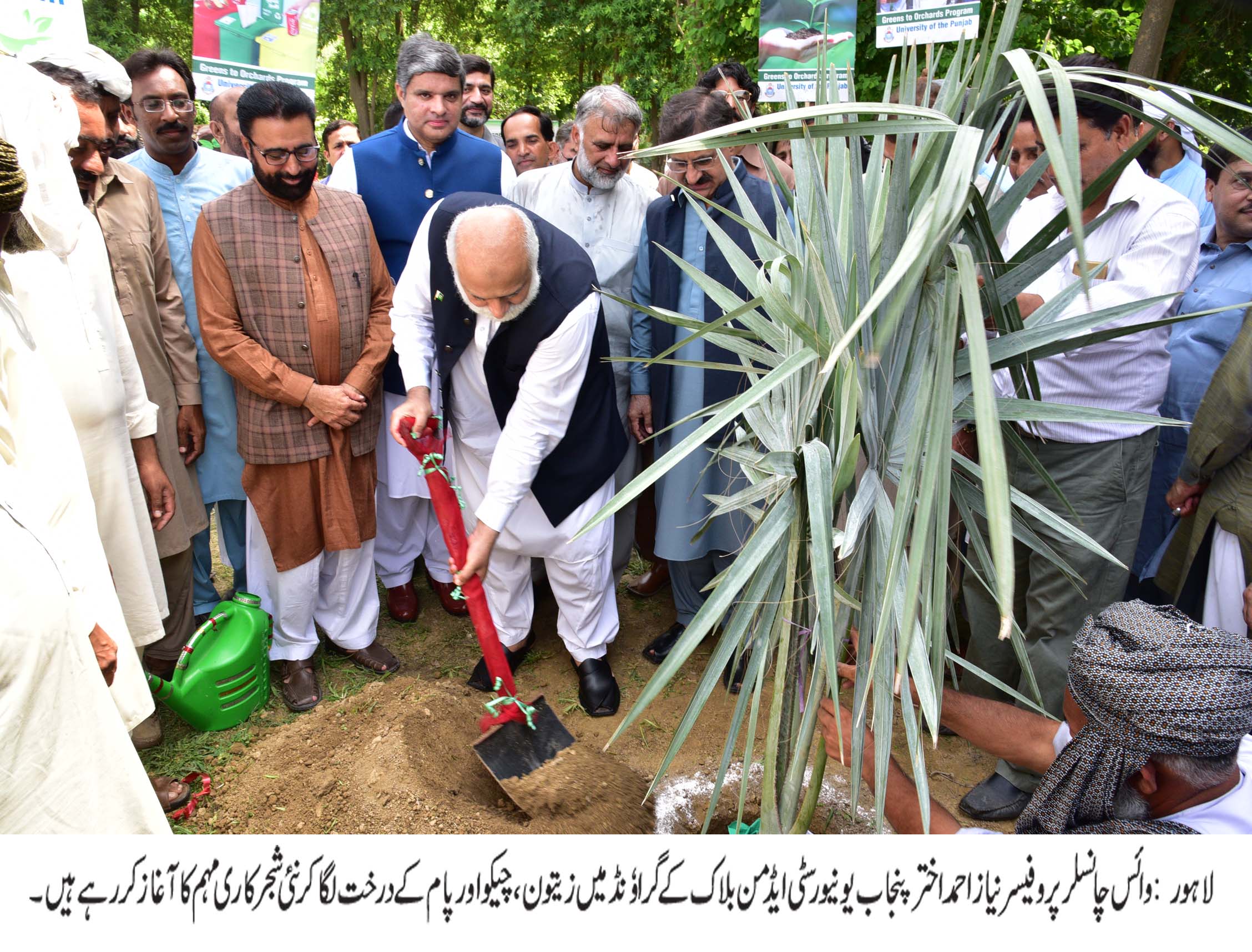 لاہور (11اگست،بدھ):وائس چانسلرپروفیسرنیازاحمداختر نے پنجاب یونیورسٹی ایڈمن بلاک کے گراوٗنڈ میں زیتون، چیکو اور پام کے درخت لگا کر نئی شجر کاری مہم کا آغاز کیا۔ افتتاحی تقریب میں پرو وائس چانسلر ڈاکٹر سلیم مظہر، رجسٹرار ڈاکٹر محمد خالد خان،اقامتی آفیسر دوئم جلیل طارق،فیکلٹی ممبران، افسران و ملازمین نے شرکت کی۔ تقریب سے خطاب کرتے ہوئے وائس چانسلر پروفیسر نیازاحمد نے کہا کہ انسان و حیوانات کی بقاء کے لئے ذیادہ سے ذیادہ درخت لگانا لازمی ہے۔ انہوں نے کہا کہ قدرتی ماحول کو محفوظ بنانا ہر انسان کی بنیادی ذمہ داری ہے۔ انہوں نے کہا کہ لاہور شہر کی فضاء کو بہتر بنانے کے لئے پنجاب یونیورسٹی اہم کردار ادا کر رہی ہے۔ اقامتی آفیسر جلیل طارق نے کہا کہ گزشتہ ڈیڑھ سال میں 15 ہزار پھلدار درخت لگائے جا چکے ہیں۔ انہوں نے کہا کہ کیمپس کے مختلف حصوں میں پھلدار درختوں کے باغات قائم کر دئیے ہیں۔ انہوں نے کہا کہ کیمپس میں چالیس اقسام کے پھلدار درخت لگا ئے گئے ہیں