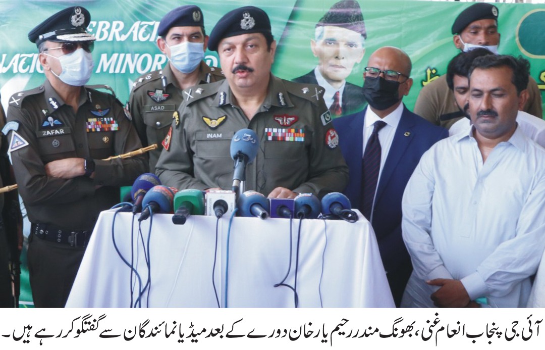 لاہور12اگست-انسپکٹر جنرل پولیس پنجاب انعام غنی نے کہاہے کہ میں یہاں آج ہندو کمیونٹی سے اظہار یک جہتی اور انہیں تحفظ کا احساس دلانے کیلئے حکومت پنجاب کے نمائندے کے طور پر بھونگ آیا ہوں۔ اسلام ایسا آفاقی مذہب ہے جس میں اقلیتوں کے حقوق واضح ہیں اور میں آپ سب کو یہ یقین دلاتا ہوں کہ انسپکٹر جنرل پولیس پنجاب اور ایک مسلمان ہونے کے ناطے میری یہ قانونی، مذہبی اور اخلاقی ذمہ داری بھی ہے کہ قانون اور مذہب میں اقلیتوں کو جوحقوق دئیے گئے ہیں ان کی مکمل پاسداری کی جائے اور اس کیلئے قانون کے دائرے میں رہتے ہوئے جو بھی اقدامات درکار ہوں ان سے گریز نہ کیا جائے۔ انہوں نے مزید کہاکہ مذہب، فرقہ، قومیت اور مسلک کی تفریق سے بالا تر ہوکر صوبے میں بسنے والے تمام شہریوں کی جان ومال، عزت و آبرو،مذہبی مقامات اور املاک کا تحفظ حکومت پنجاب اور پنجاب پولیس کی اولین ذمہ داری ہے اور اس مقصد کیلئے پنجاب پولیس ہر ممکن اقدامات کر رہی ہے۔ انہوں نے مزیدکہاکہ اقلیتی عبادت گاہوں پر سیکیورٹی نفری کی مستقل تعیناتی کیلئے وزیر اعلی پنجاب کو سمری بھجوائی جاچکی ہے جس کی منظوری کے بعد صوبے کے تمام مذاہب بالخصوص اقلیتی دینی عبادت گاہوں کی سیکیورٹی کیلئے مستقل بنیادوں پرمخصوص نفری تعینات رہے گی۔انہوں نے مزیدکہاکہ بھونگ واقعہ میں پنجاب پولیس نے پہلے انسانی جانوں، بعد میں مندر، سی پیک اور موٹر وے کی سیکیورٹی کو یقینی بنایاکیونکہ انسانی جان کے نقصان کا ازالہ کسی صورت ممکن نہیں۔ انہوں نے بھونگ واقعہ میں ملک دشمن عناصر کی شمولیت کوخارج از امکان قرار دیتے ہوئے کہاکہ کچھ طاقتیں فرقہ واریت اور شرپسندی کو پسندی کو فروغ دے کر پاکستان کے عالمی تشخص کو نقصان پہنچانا چاہتی ہیں لیکن ایسے شرپسند اور ملک دشمن عناصر یہ بات غور سے سن لیں کہ انکے مذموم عزائم کو ناکام بنانے کیلئے پنجاب پولیس ہر لمحہ سرگرم اور تیار ہے لہذا تمام پہلوؤں کو مد نظر رکھتے ہوئے اس واقعہ میں درج تینوں مقدمات کی تفتیش کو آگے بڑھایا جارہا ہے اور ذمہ داران کو قرار واقعی سزا دلوانے میں کوئی کسر نہیں چھوڑی جائے گی۔ انہوں نے مزیدکہاکہ ہم عدالتوں کا بے پناہ احترام کرتے ہیں اور سپریم کورٹ کی ہدایات اور احکامات پرمن و عن عمل درآمد یقینی بنایا گیا ہے اور اس حوالے سے کورٹ میں رپورٹ جمع کروائی جاچکی ہے جبکہ نئی رپورٹ میں حالیہ ہونے والے اقدامات اور مستقبل پلان بارے تفصیلات بتائی جائیں گی۔ انہوں نے امید ظاہر کی کہ سپریم کورٹ پنجاب پولیس کے اقدامات سے مطمئن ہوگی۔ ان خیالات کا اظہار انہوں نے آج رحیم یار خان میں بھونگ مندر کے دورے کے موقع پر میڈیا نمائندگان سے گفتگو کرتے ہوئے کیا۔ اس موقع پر ایڈیشنل آئی جی جنوبی پنجاب کیپٹن (ر) ظفر اقبال اعوان، ڈی پی او رحیم یار اسد سرفراز خان سمیت ہندو کمیونٹی کے مقامی عمائدین بھی موجود تھے۔